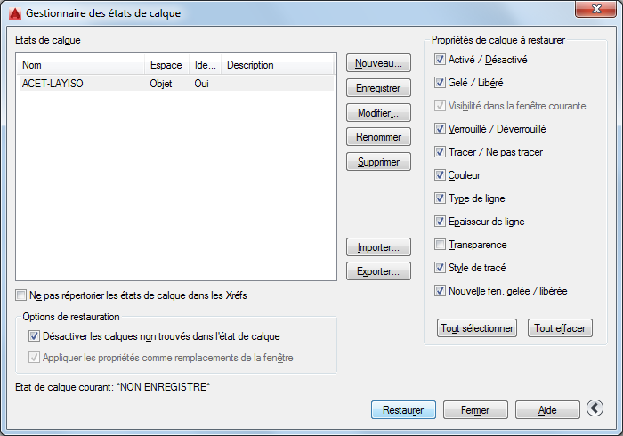 Affiche la liste des états de calques enregistrés dans le dessin.