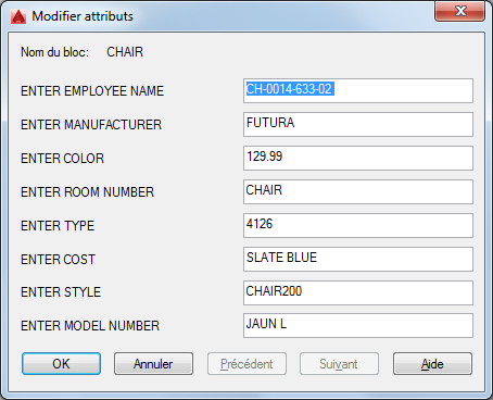 Affiche les huit premiers attributs contenus dans le bloc. Vous pouvez modifier les valeurs d'attribut. Il est impossible de modifier les valeurs d'attributs situées sur des calques verrouillés.