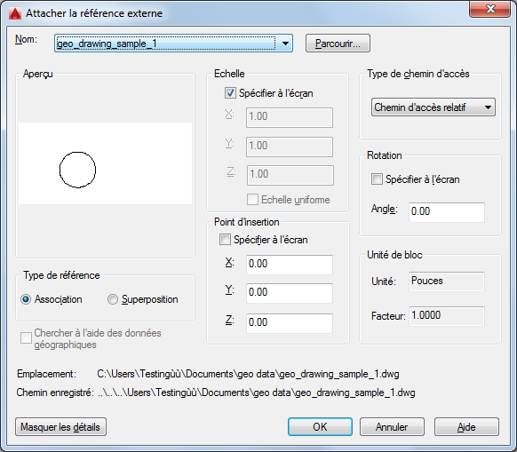 Affiche le chemin d'accès enregistré avec le dessin lorsque la référence externe est attachée. Ce chemin d'accès dépend du paramètre Type de chemin d'accès.