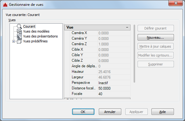 Pour toutes les vues à l'exception des présentations, spécifie la distance focale (en millimètres). En modifiant cette valeur, le paramètre Focale est également modifié.