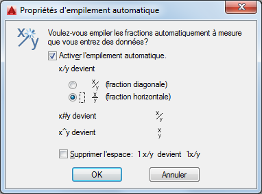 Convertit le caractère barre oblique (/) en barre de fraction diagonale lorsque l'empilement automatique est activé.