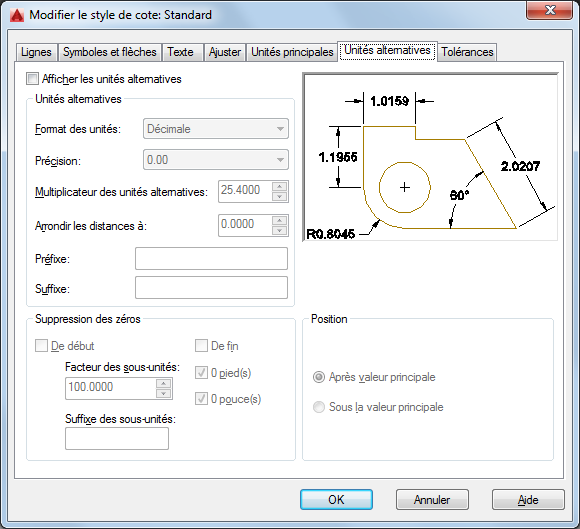 Spécifie l'affichage d'unités alternatives dans les mesures de cote, et définit leur format et leur précision.