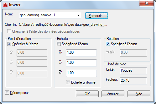 Permet d'indiquer le nom du bloc ou du dessin à insérer, ainsi que son emplacement.