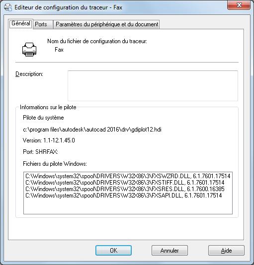 - Nom de l'imprimante système (si le traceur configuré correspond à l'imprimante système)