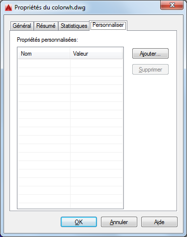 Affiche la boîte de dialogue Ajouter une propriété personnalisée, qui permet de spécifier un nom et une valeur pour la nouvelle propriété personnalisée. Le nom doit être unique. La valeur peut ne pas être renseignée.