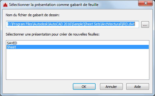 Indique le chemin de dossier, le fichier gabarit de dessin (DWT) et le nom de présentation à utiliser pour créer des feuilles.