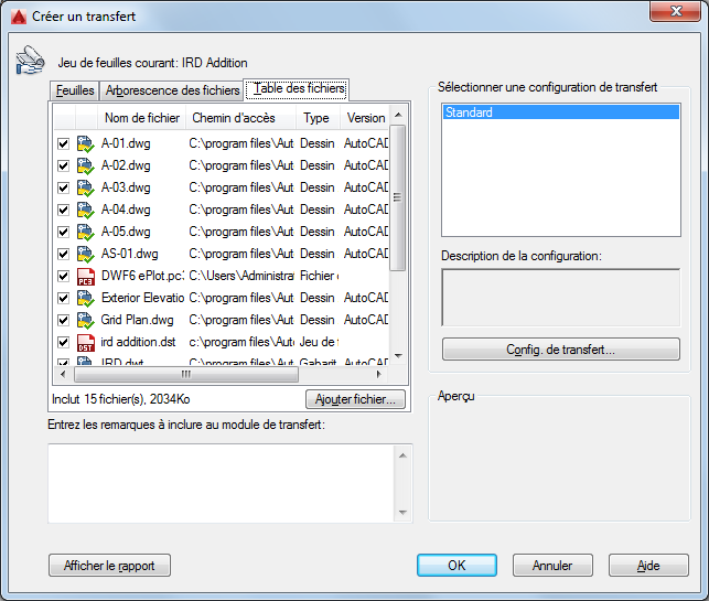 Par défaut, tous les fichiers associés au dessin courant (tels que les fichiers externes, les styles de tracé et les polices) sont listés. Vous pouvez ajouter des fichiers au module de transfert ou supprimer des fichiers existants. Les fichiers associés référencés par des URL ne sont pas inclus dans le module de transfert.