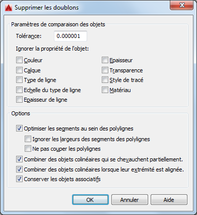 Supprime la géométrie en double ainsi que les lignes, arcs et polylignes qui se chevauchent. Combine également les lignes, arcs et polylignes se chevauchant ou contigus.