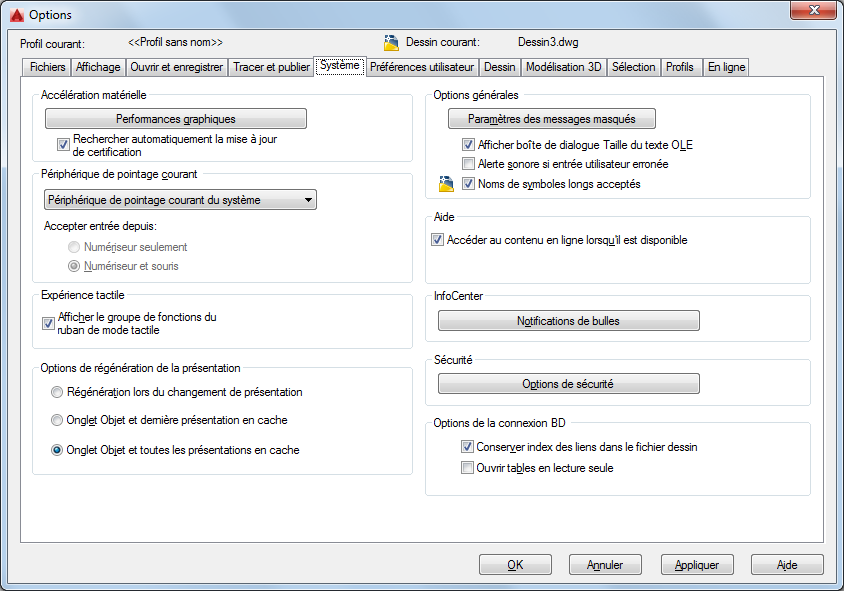 Pour chaque onglet, la liste d'affichage est mise à jour soit en régénérant le dessin, soit en sauvegardant la liste d'affichage en mémoire et en ne régénérant que les objets modifiés lorsque vous choisissez cet onglet. La modification de ces paramètres peut améliorer les performances. (variable système LAYOUTREGENCTL).