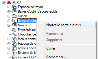 Une nouvelle barre d'outils (nommée Barre d'outils1) est placée au bas de l'arborescence des barres d'outils.