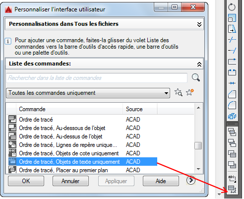 2. Dans le volet Liste des commandes, faites glisser la commande que vous voulez ajouter jusqu'à la barre d'outils de votre choix dans le volet Personnalisations dans <nom de fichier>.