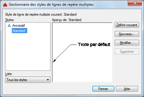 Supprime le style sélectionné dans la liste Styles. Vous ne pouvez pas supprimer le style en cours d'utilisation dans le dessin.