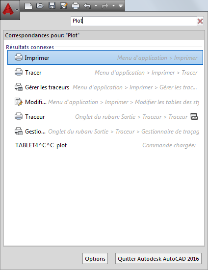 Le champ de recherche de commande s'affiche en haut du menu de l'application. Les résultats de la recherche peuvent inclure des commandes de menu, des info-bulles de base et des chaînes de texte d'invite de commande. Vous pouvez entrer un terme à rechercher dans n'importe quelle langue. Les résultats s'appliquent à l'espace de travail courant.