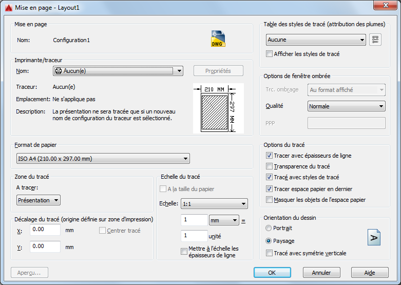Un format de papier par défaut est défini pour le périphérique de traçage lorsque vous créez un fichier PC3 à l'aide de l'assistant Ajouter un traceur. Pour plus d'informations sur cet assistant, voir la section "Configuration des traceurs et des imprimantes" dans le Guide des pilotes et des périphériques. Le format de papier que vous sélectionnez dans la boîte de dialogue Mise en page est enregistré avec la présentation et a priorité sur le paramétrage du fichier PC3.