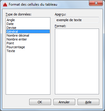 Affiche la liste des types de données (Angle, Date, Nombre décimal, etc.) pouvant être formatés dans les lignes du tableau.