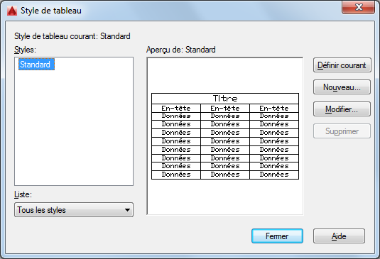 Supprime le style de tableau sélectionné dans la liste Styles. Vous ne pouvez pas supprimer le style en cours d'utilisation dans le dessin.