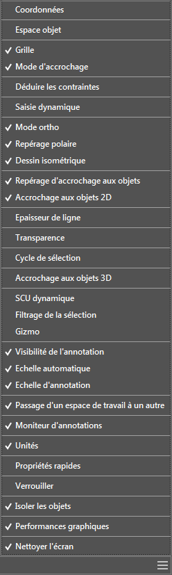 La barre d'état permet d'accéder rapidement à des outils ayant une incidence sur l'environnement de dessin.