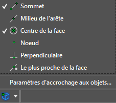Trouver | Accrochage aux objets 2D | Accroche le curseur au point de référence 2D le plus proche pendant le déplacement du curseur. Il peut s'agir d'extrémités, de milieux, de centres de cercles, et ainsi de suite. |
