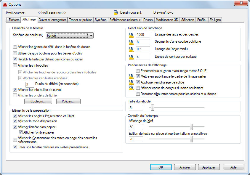 Gère les paramètres d'affichage spécifiques de l'environnement de dessin.