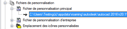 - Dans l'Explorateur Windows ou l'Explorateur de fichiers, accédez à l'emplacement suivant : <lecteur>:\Users\<nom du profil utilisateur>\AppData\Roaming\Autodesk\<nom du produit>\<numéro de version>\<langue>\support\<nom du fichier de personnalisation>.cuix