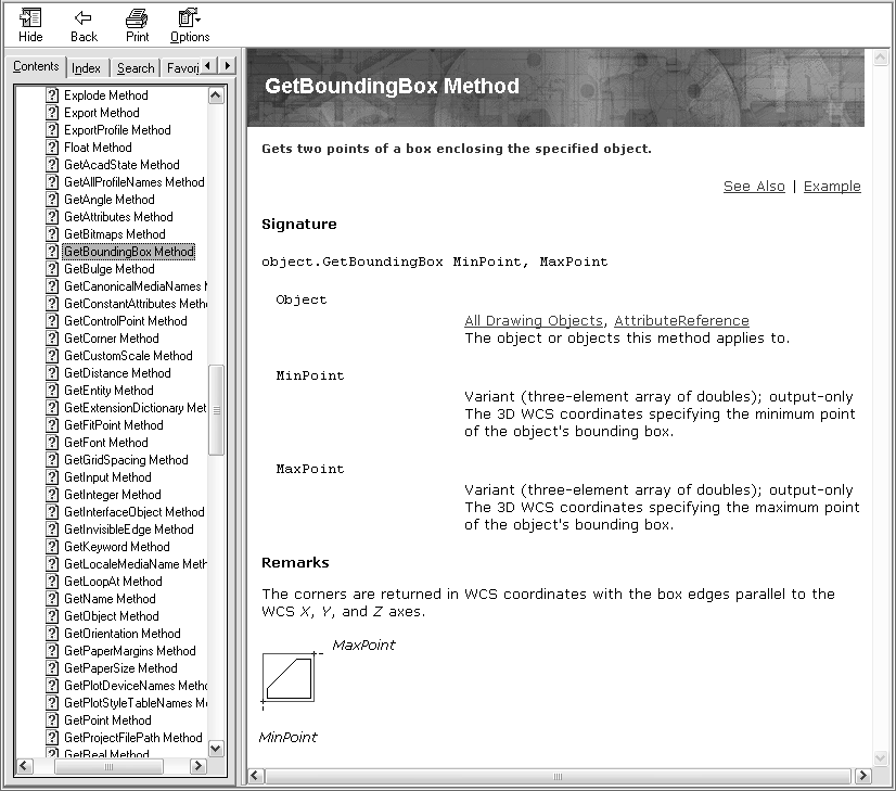 Some ActiveX methods require that you supply them with variables into which the methods can place values. The GetBoundingBox method is an example of this type of method. Here is how it is defined in the ActiveX and VBA Reference: