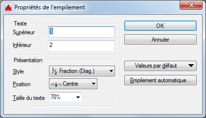 Affiche la boîte de dialogue Propriétés d'empilement automatique. La fonction d'empilement automatique empile uniquement les caractères numériques situés immédiatement avant et après les caractères accent circonflexe, barre oblique et dièse. Pour empiler des caractères non numériques ou du texte comprenant des espaces, sélectionnez le texte et cliquez sur Empiler dans le menu contextuel de l'éditeur de texte.