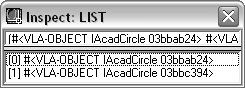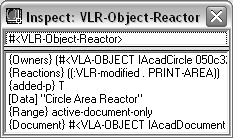 You can verify that the reactor has changed by using the VLISP Inspect feature. If the Inspect window shown in About Inspecting Reactors (AutoLISP) is still displayed in your VLISP session, right-click in the window's object line and choose Update. If you've modified the circleReactor reactor as shown in this section, the updated Inspect window will look like the following: