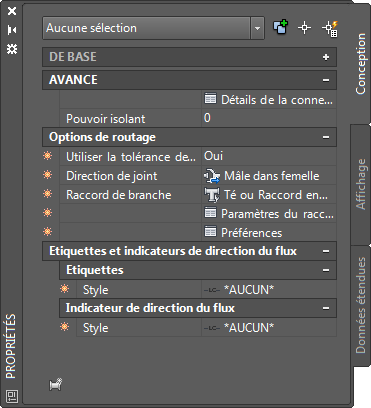 Il s'agit des propriétés de l'onglet Conception de la palette des propriétés que vous utilisez pour l'ajout d'objets de tuyauterie.