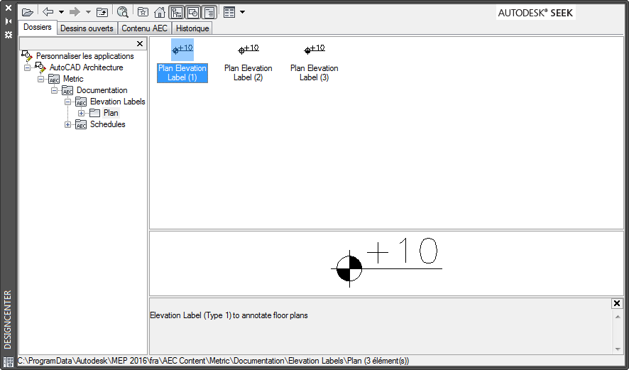 Le contenu AEC (données architecturales, d'ingénierie et de construction) est composé de dessins, de symboles, de styles d'objets et de procédures d'annotation que vous ajoutez aux dessins afin de concevoir et de documenter votre projet. Vous pouvez créer un outil dans une palette d'outils à l'aide du contenu AEC prédéfini, accessible via DesignCenter. Vous pouvez également créer des outils à partir de blocs dans DesignCenter, mais ceux-ci sont associés à des options d'outils légèrement différentes.