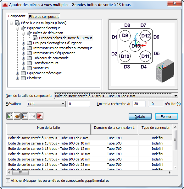 Les boîtes de dialogue Ajouter des pièces à vues multiples et Modification de pièces à vues multiples contiennent également l'onglet Filtre de composant, qui permet de rechercher une taille de composant spécifique en spécifiant les propriétés des composants recherchés. Pour afficher les tailles de composant disponibles dans une famille de composants, cliquez sur le bouton Détails. Pour faciliter le processus de recherche, les tailles de composant disponibles s'affichent sous forme de tableau. Sélectionnez Afficher/Masquer les paramètres du composant supplémentaire pour afficher tous les paramètres dans le tableau.