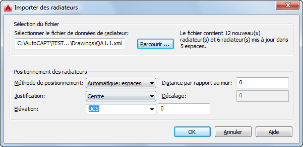 Vous pouvez ajouter des radiateurs à un dessin à l'aide des données d'un fichier XML produites par un programme de calcul des charges de chauffage tel que SOLAR COMPUTER Desktop. Le fichier XML contient un identifiant pour un ou plusieurs espaces dans le modèle. Chaque identifiant d'espace dans le fichier précède une liste des radiateurs devant être placés dans l'espace.