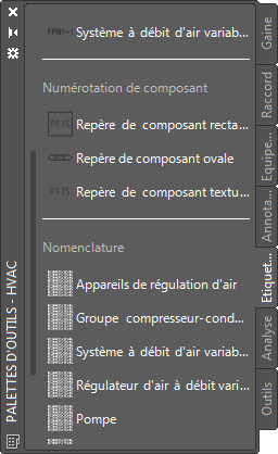 Les outils de repères de composants permettent de numéroter les différentes étiquettes séparément ou sous forme de séquence. Les composants de même type peuvent être associés au même numéro. Les repères de composants peuvent contenir des numéros ou du texte et peuvent s'utiliser avec tous les objets MEP. En revanche, les outils de nomenclature de la palette d'outils Etiquette et nomenclature s'utilisent uniquement avec les systèmes de gaines et de tuyauterie. Pour plus d'informations, reportez-vous à la rubrique Utilisation des repères de composants et des nomenclatures.