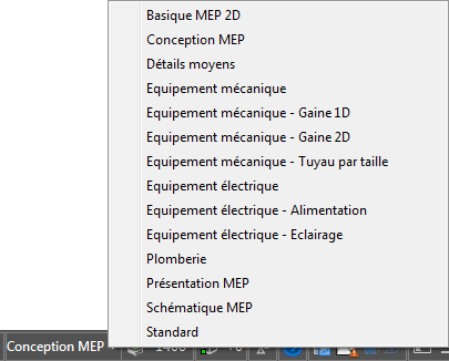 AutoCAD MEP utilise des vues orthogonales et isométriques dans les dessins, mais contient également de nombreux paramètres d'affichage déterminant l'aspect des objets. Les représentations d'affichage déterminent l'affichage des objets dans les différentes vues. Les configurations d'affichage désignent des groupes de représentation d'affichage conçus pour des tâches spécifiques. Par exemple, vous pouvez transformer une configuration d'affichage 1D en configuration d'affichage 2D. Vous pouvez également définir des configurations d'affichage spécifiques aux différentes disciplines. Par exemple, vous pouvez définir une configuration d'affichage représentant les systèmes mécaniques dans une couleur et un type de ligne donnés tout en masquant les autres types de systèmes.