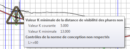 La courbe ne respecte toujours pas la valeur K minimale pour la distance de visibilité de dépassement, c'est pourquoi les symboles d'avertissement restent affichés. Pour faire disparaître un symbole d'avertissement, l'entité doit respecter toutes les valeurs indiquées dans le fichier de normes de conception et dans les contrôle de la norme de conception appliqués.