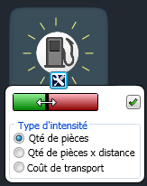 Affiche les couts de transport en fonction de la sélection. Repositionnez les unités de production pour modifier les résultats de l'analyse. Les coûts de transport sont générés à partir de plusieurs variables définies dans les Options de Factory. |
