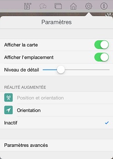 Afficher l'emplacement : permet de masquer ou d'afficher votre position actuelle dans l'encart et dans le modèle. Vous devez vous trouver dans les limites du modèle pour afficher votre emplacement actuel. Vérifiez que le service de localisation de l'iPad est activé. Dans l'encart, votre emplacement actuel est indiqué par un petit point rouge. Dans le modèle, il est indiqué par un avatar.