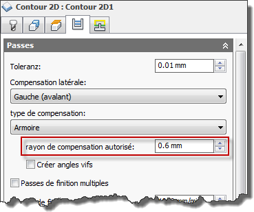 Inventor HSM Express résout ces problèmes grâce au paramètre Rayon de compensation autorisé disponible sous l'onglet Passes.