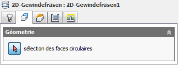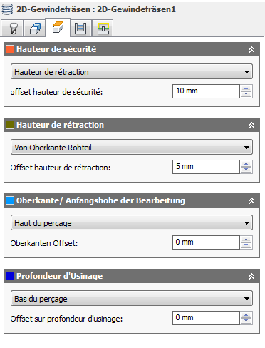 L'opération Taraudage est utilisée pour le taraudage de poches et d'îlots cylindriques. Les hauteurs et les profondeurs sont automatiquement calculées à partir de la géométrie sélectionnée, ce qui vous permet d'usiner différents filetages en une seule opération.