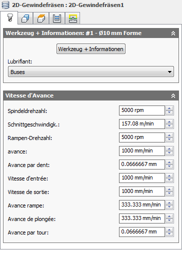 Vitesse de rotation de la broche lors des mouvements de la rampe.
