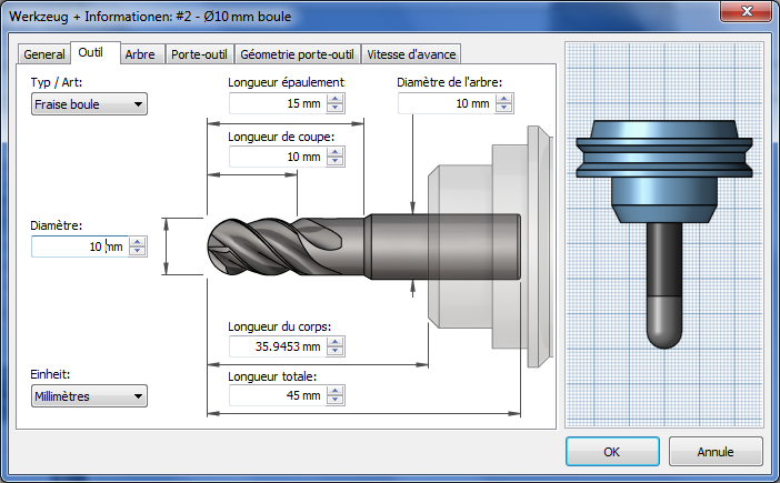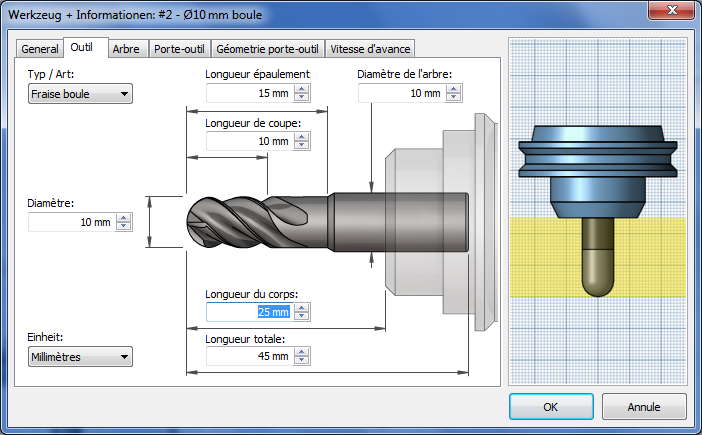 L'avertissement suivant est inscrit dans le journal lors de la génération de la trajectoire d'outil alors que l'option Détection de la longueur d'outil est active et que l'outil est trop court : Avertissement: la longueur de l'outil, initialement définie sur 25 mm, a été remplacée par la valeur 35,9453 mm pour veiller à ce que le porte-outil n'entre pas en contact avec la pièce.