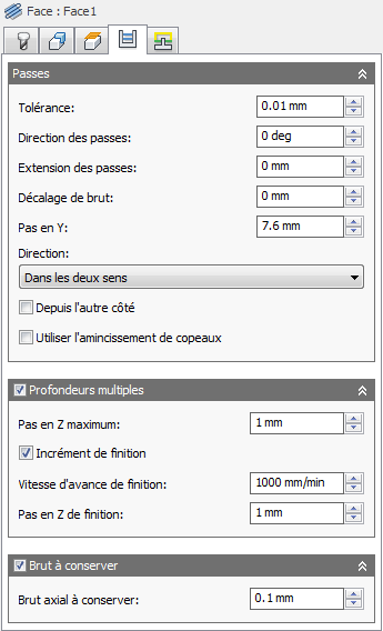Dans le cadre des opérations de finition, la valeur par défaut est égale à 0 mm/0 po ; autrement dit, aucune quantité de matière n'est conservée.