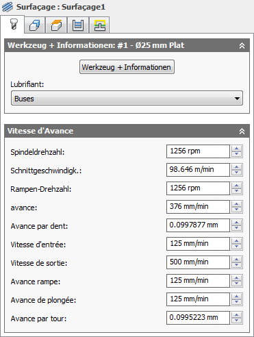 Vitesse de la broche exprimée en tant que vitesse de l'outil sur la surface.