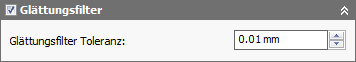 Actuellement, seuls deux paramètres permettent de contrôler le lissage. Vous pouvez activer/désactiver le lissage et définir la tolérance utilisée. Le lissage est toujours désactivé par défaut. La tolérance totale d'une opération est indiquée par la tolérance d'usinage et par la tolérance de lissage lorsque le filtre de lissage est activé. La tolérance par défaut est dérivée de la stratégie et de la tolérance d'usinage. Pour les opérations de finition, la tolérance de filtre est normalement comprise dans une plage de 50 % à 200 % par rapport à la tolérance d'usinage indiquée, où 100 % donnera probablement un bon résultat. Pour les opérations d'ébauchage, la tolérance de filtre est normalement comprise dans une plage de 5 % à 20 %, où 10 % devrait donner de bons résultats.