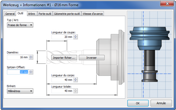 L'utilisation de cet outil est semblable à celle de tous les autres outils. Il vous suffit de garder à l'esprit que la trajectoire d'outil est créée en fonction du point de correction défini par le diamètre et le décalage du bout.