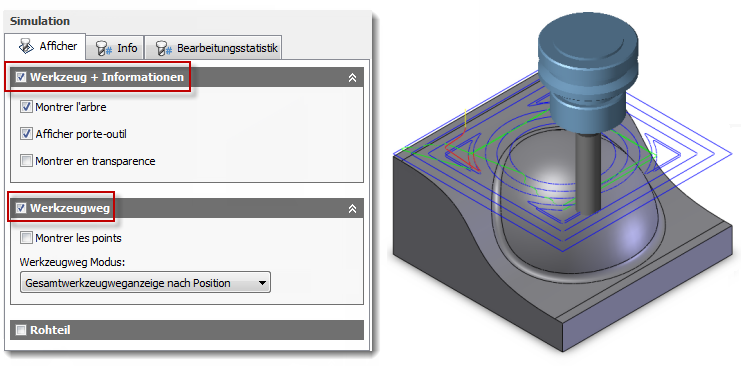 Simulation avec l'outil et la trajectoire d'outil affichés