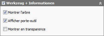 Le groupe Outil vous permet d'activer ou de désactiver la visibilité de l'arbre et du porte-outil de l'outil pendant la simulation. Vous pouvez également choisir de les afficher en transparence, ce qui vous permet de voir à travers.