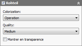 Le groupe Brut vous permet de spécifier si le brut est affiché ou non en cochant la case Brut située dans la partie supérieure gauche du groupe. Il contient également diverses options permettant de contrôler la coloration, la qualité, la matière et la transparence du brut. Les utilisateurs d'Inventor HSM et d'Inventor HSM Professional peuvent également choisir entre les modes de simulation du brut Standard et Rapide (3 axes uniquement). Pour plus d'informations sur la coloration du brut, reportez-vous à la rubrique d'aide d'Inventor HSM Express : A propos de l'affichage de la simulation du brut.