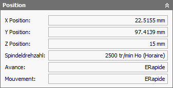 Le groupe Position contient des informations sur la position actuelle de l'outil. Ces informations incluent la position actuelle, la vitesse de la broche, l'avance et le mouvement. En mode hors animation, les informations s'appliquent à la position actuellement mise en surbrillance si elle est active et, dans le cas contraire, à la position actuelle de l'outil, tandis que, en mode animation, la position actuelle de l'outil est toujours affichée.