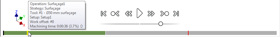 Simulation : vous pouvez contrôler la position actuelle de l'outil sur le curseur de positionnement situé dans le lecteur de simulation, dans la partie inférieure de la vue de simulation.