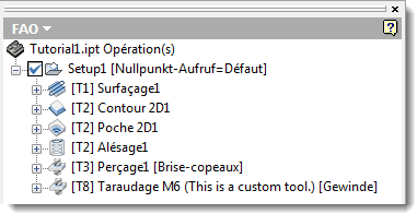 Inventor HSM Express peut afficher des informations supplémentaires dans le navigateur FAO en regard du nom d'un élément.